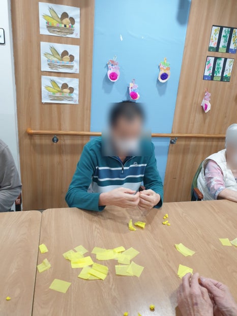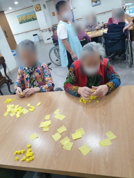 오늘 미술 프로그램 시간에는 어르신들이 노란색 종이를