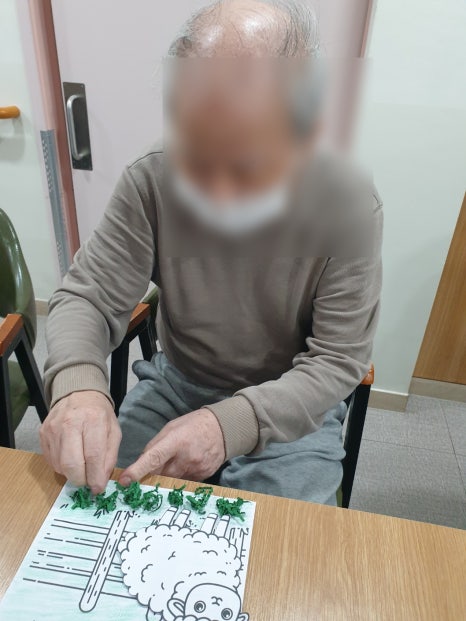 어르신들만의 색으로 칠하고, 양 그림에 팝콘을 붙여 각자의